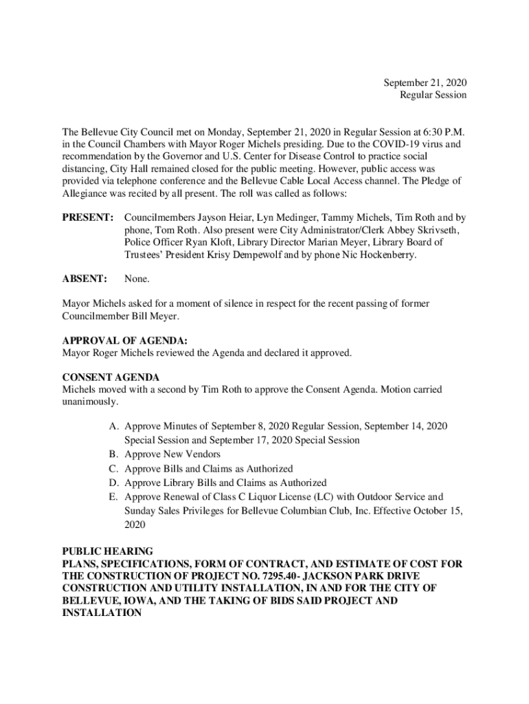 September 21, 2020, Regular Session Bellevue City Council met on Monday, September 21, 2020, in Regular Session at 6:30 P.M. in the Council Chambers with Mayor Roger Michel's presiding. Due to the