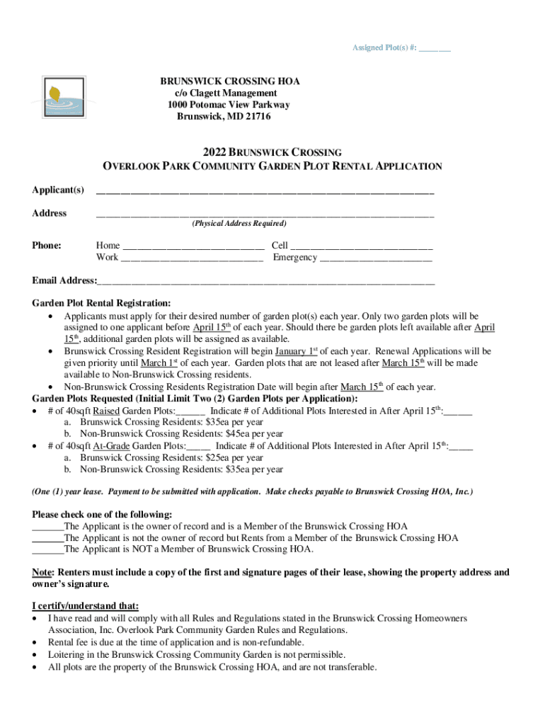 Assigned Plot(s) #: ___BRUNSWICK CROSSING HOA c/o Claret Management 1000 Potomac View Parkway Brunswick, MD 217162022 BRUNSWICK CROSSING OVERLOOK PARK COMMUNITY GARDEN PLOT RENTAL APPLICATION Applicant(s)___Address___
