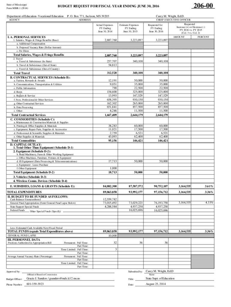 State of Mississippi Form MBR1 (2014)20600BUDGET REQUEST FOR FISCAL YEAR ENDING JUNE 30, 2016Department of Education Vocational Education. O. Box 771, Jackson, MS 39205AGENCYCarey M. Wright, Ed. D.ADDRESSCHIEF