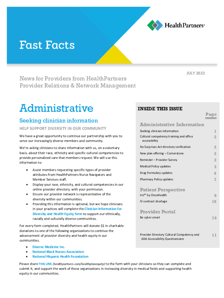 JULY 2022News for Providers from HealthPartners Provider Relations & Network ManagementAdministrative Seeking clinician information HELP SUPPORT DIVERSITY IN OUR COMMUNITYINSIDE THIS ISSUEPageAdministrative