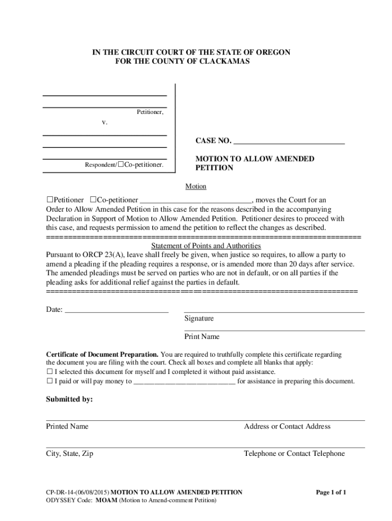 IN THE CIRCUIT COURT OF THE STATE OF OREGON FOR THE COUNTY OF CLACKAMASPetitioner, v. CASE NO. ___ Respondent/Copetitioner.MOTION TO ALLOW AMENDED PETITION MotionPetitioner Copetitioner ___, moves