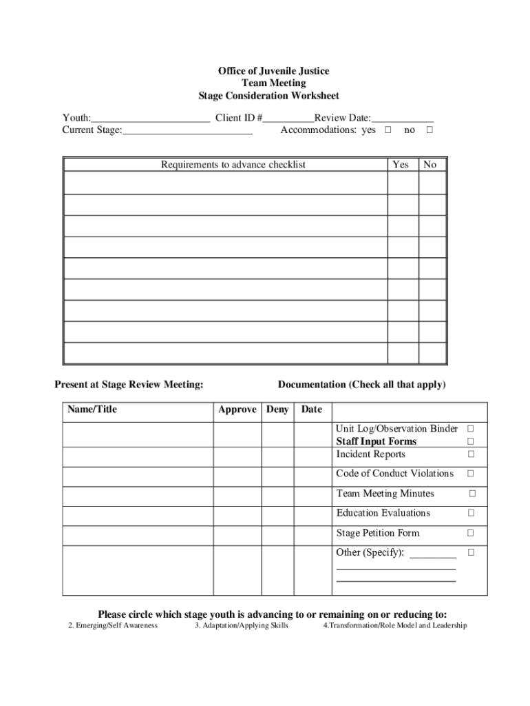Office of Juvenile Justice Team Meeting Stage Consideration Worksheet Youth:___ Client ID #___Review Date:___ Current Stage:___ Accommodations: yes no Requirements to advance checklistPresent at Stage