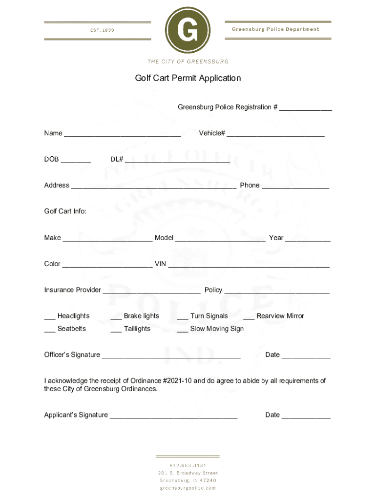 Golf Cart Permit Application Greensburg Police Registration # ___ Name ___ DOB ___Vehicle# ___DL# ___Address ___ Phone ___ Golf Cart Info: Make ___ Model ___ Year ___ Color ___ VIN ___ Insurance Provider