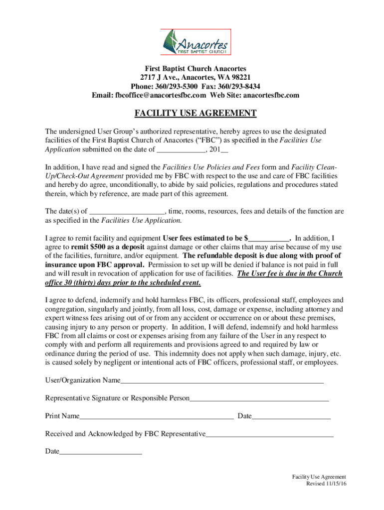 First Baptist Church Anacortes 2717 J Ave., Anacortes, WA 98221 Phone: 360/2935300 Fax: 360/2938434 Email: fbcoffice@anacortesfbc.com Website: Anacortes. Facility USE AGREEMENT The undersigned User