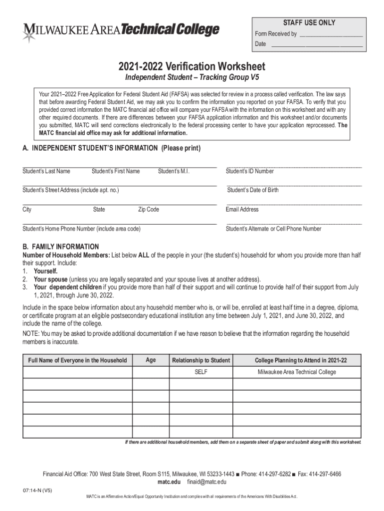 Get the free 2021-2022 Verification Worksheet - Milwaukee Area Technical College