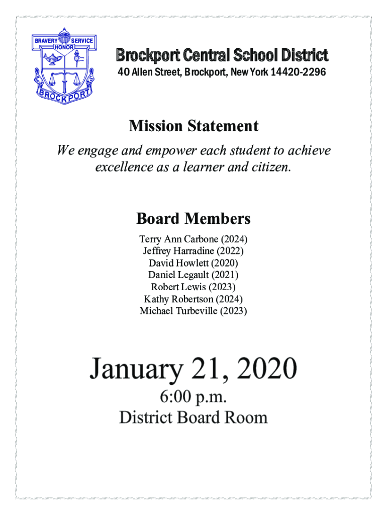 Brock port Central School District 40 Allen Street, Brock port, New York 144202296Mission Statement We engage and empower each student to achieve excellence as a learner and citizen. Board Members