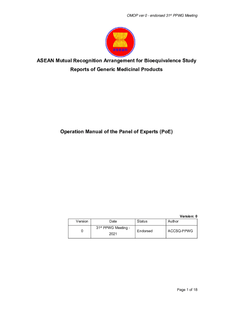 MOP very 0 endorsed 31st PWG MeetingASEAN Mutual Recognition Arrangement for Bioequivalence Study Reports of Generic Medicinal ProductsOperation Manual of the Panel of Experts (POE)Version: 0 Version