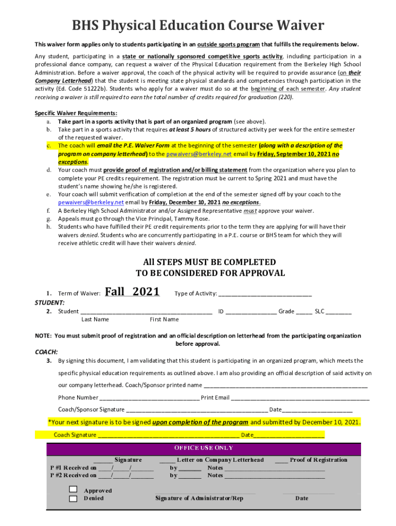 Get the free BHS Physical Education Course Waiver - Berkeley High School - bhs berkeleyschools