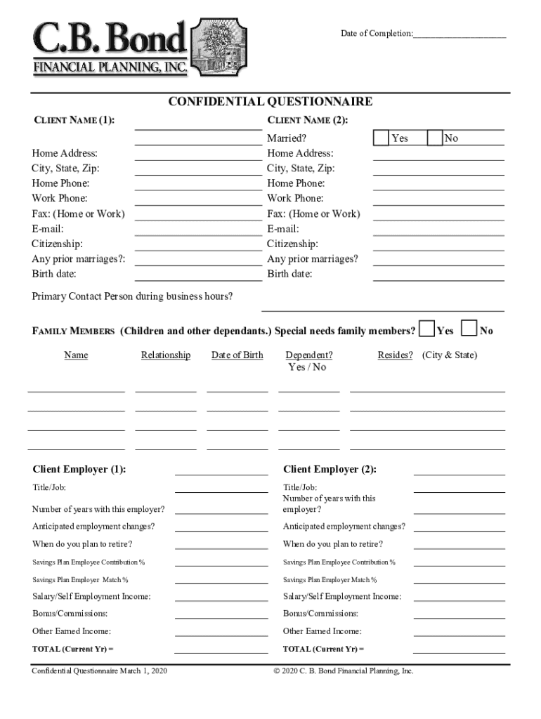 Date of Completion:___CONFIDENTIAL QUESTIONNAIRE CLIENT NAME (1):CLIENT NAME (2):Home Address: City, State, Zip: Home Phone: Work Phone: Fax: (Home or Work) Email: Citizenship: Any prior marriages?: