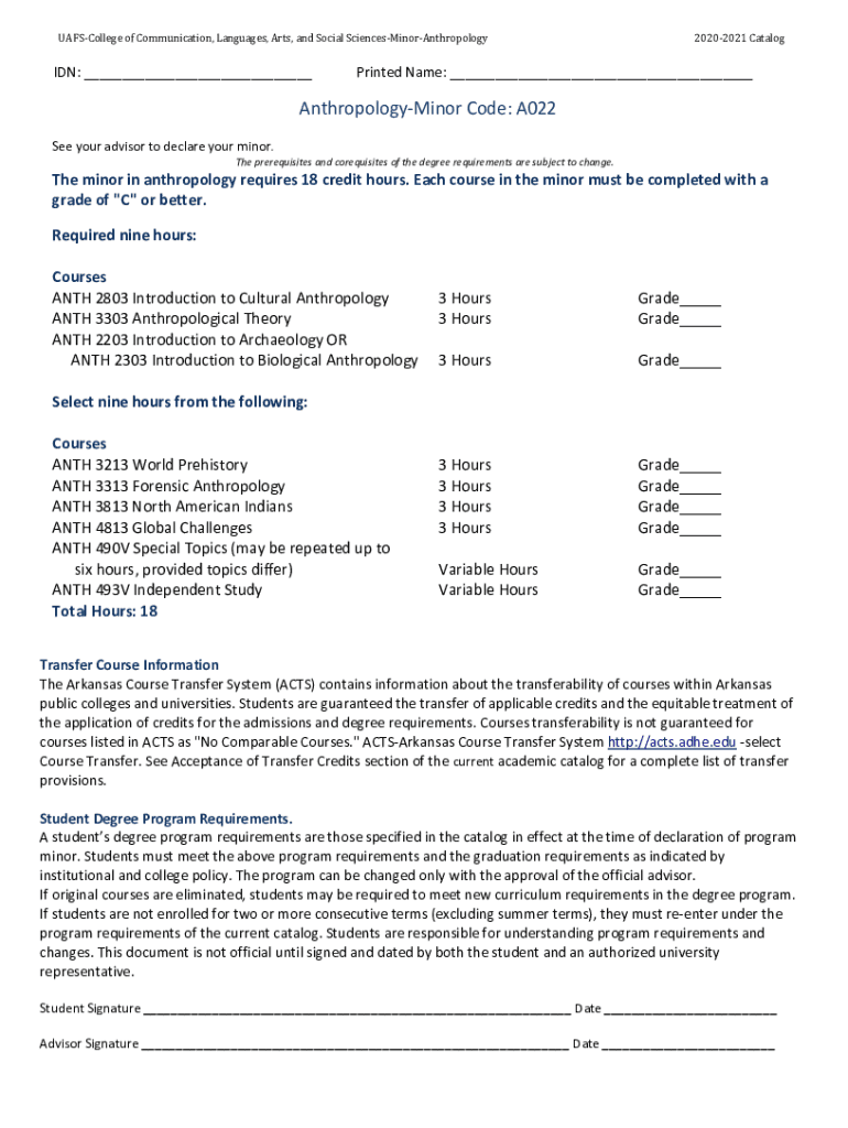 UAFSCollege of Communication, Languages, Arts, and Social SciencesMinorAnthropologyIDN: ___20202021 CatalogPrinted Name: ___AnthropologyMinor Code: A022 See your advisor to declare your minor. The