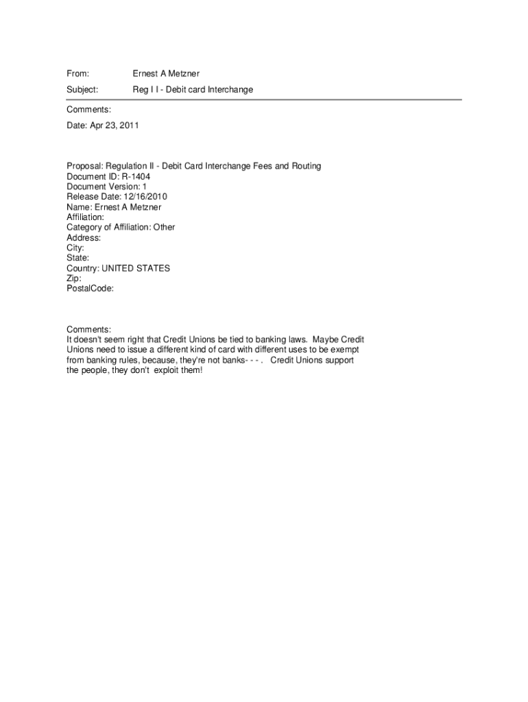 From:Ernest A MetznerSubject:Reg I Debit card InterchangeComments: Date: Apr 23, 2011Proposal: Regulation II Debit Card Interchange Fees and Routing Document ID: R1404 Document Version: 1 Release