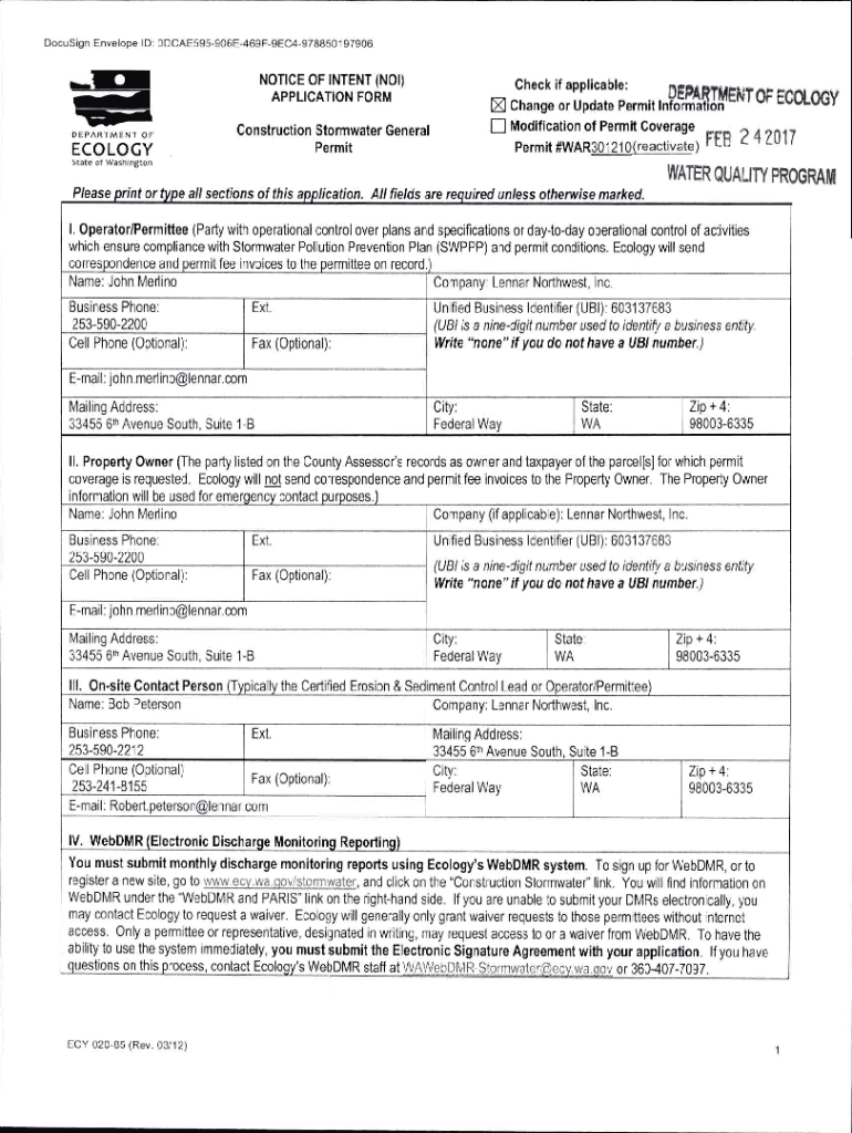 DocuSign Envelope ID: ODCAE595906E469F9EC4978850197906NOTICE OF INTENT (N01) APPLICATION FORM DEPARTMENT OFECOLOGYConstruction Stormwater General PermitCheck if applicable: DEPARTMENT OF ECOLOGY [E]