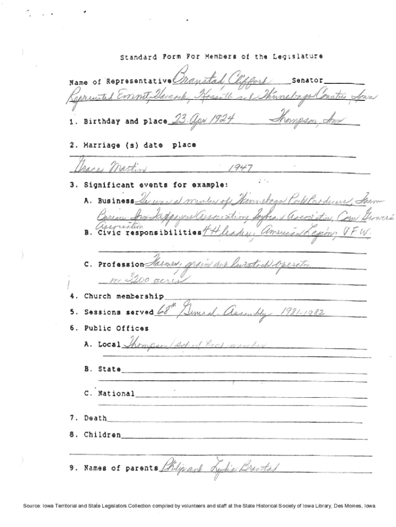 St4nda:d Form For Member of TEFL LEQ l slatureHam. 01ReprosentatiV.d::;61LSenator _ _ __!FB.4+RJ Irvin!;.1t:, \'&4., J\'/t. I__. I.ND., Wei.i;, 1. Birthday and place. J3tjw/1\': lt2. Marriage place(0)date/