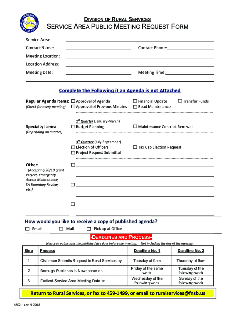 DIVISION OF RURAL SERVICES SERVICE AREA PUBLIC MEETING REQUEST FORM Service Area: Contact Name:Contact Phone:Meeting Location: Location Address: Meeting Date:Meeting Time:Complete the Following if