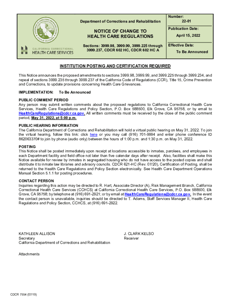 Department of Corrections and RehabilitationNOTICE OF CHANGE TO HEALTH CARE REGULATIONS Sections: 3999.98, 3999.99, 3999.225 through 3999.237, CDC 602 HC, CDC 602 HCA Number: 2201 Publication Date: