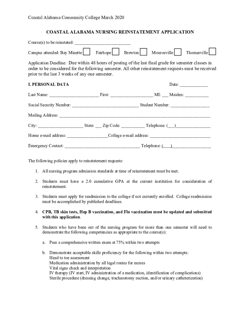 Coastal Alabama Community College March 2020NURSING PROGRAM REINSTATEMENT APPLICATIONCoastal Alabama Community College March 2020Dear Nursing Student, Thank you for your interest in returning to our