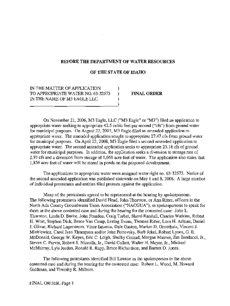 BEFORE THE DEPARTMENT OF WATER RESOURCES OF THE STATE OF IDAHOAN THE MATTER OF APPLICATION TO APPROPRIATE WATER NO. 6332573 IN THE NAME OF M3 EAGLE LLC.) ))FINAL Order November 21, 2006, M3 Eagle,
