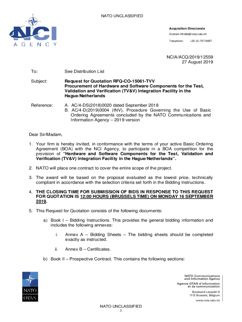 NATO UNCLASSIFIED Acquisition Directorate Graham.Hindle@ncia.nato.int Telephone:+32 (2) 707 8857NCIA/ACT/2019/12559 27 August 2019 To:See Distribution ListSubject:Request for Quotation RFQCO15061TVV