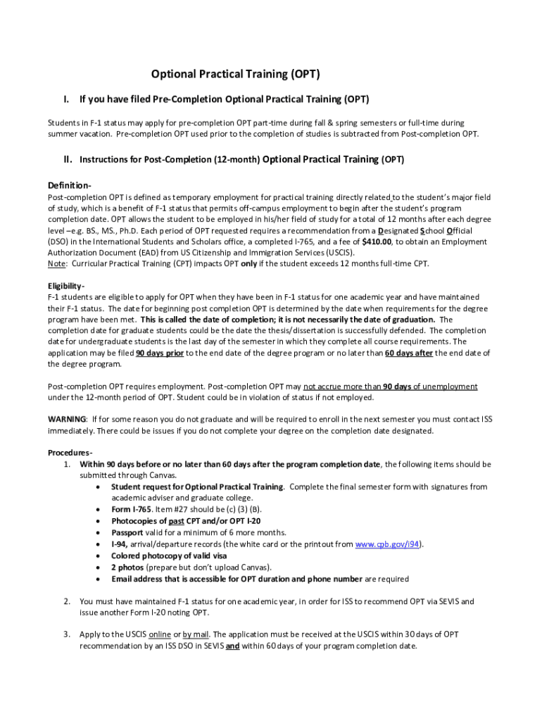 Optional Practical Training (OPT) I. If you have filed Completion Optional Practical Training (OPT) Students in F1 status may apply for completion OPT part-time during fall & spring semesters or full