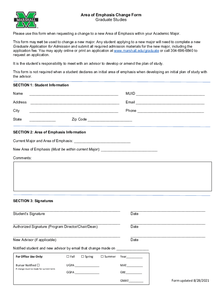 Area of Emphasis Change Form Graduate Studies Please use this form when requesting a change to a new Area of Emphasis within your Academic Major. This form may not be used to change a new major. Any