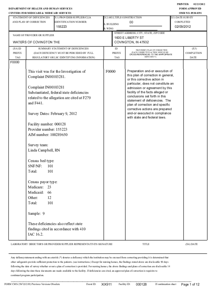 Get the free F0000 This visit was for the Investigation of Complaint IN00103281 ...