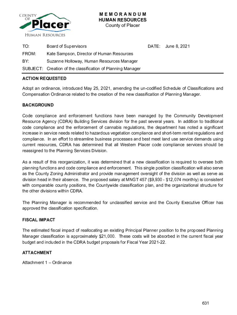 MEMORANDUM HUMAN RESOURCES County of Placer TO:Board of SupervisorsFROM:Kate Sampson, Director of Human Resources:Suzanne Holloway, Human Resources Managerial:June 8, 2021SUBJECT: Creation of the