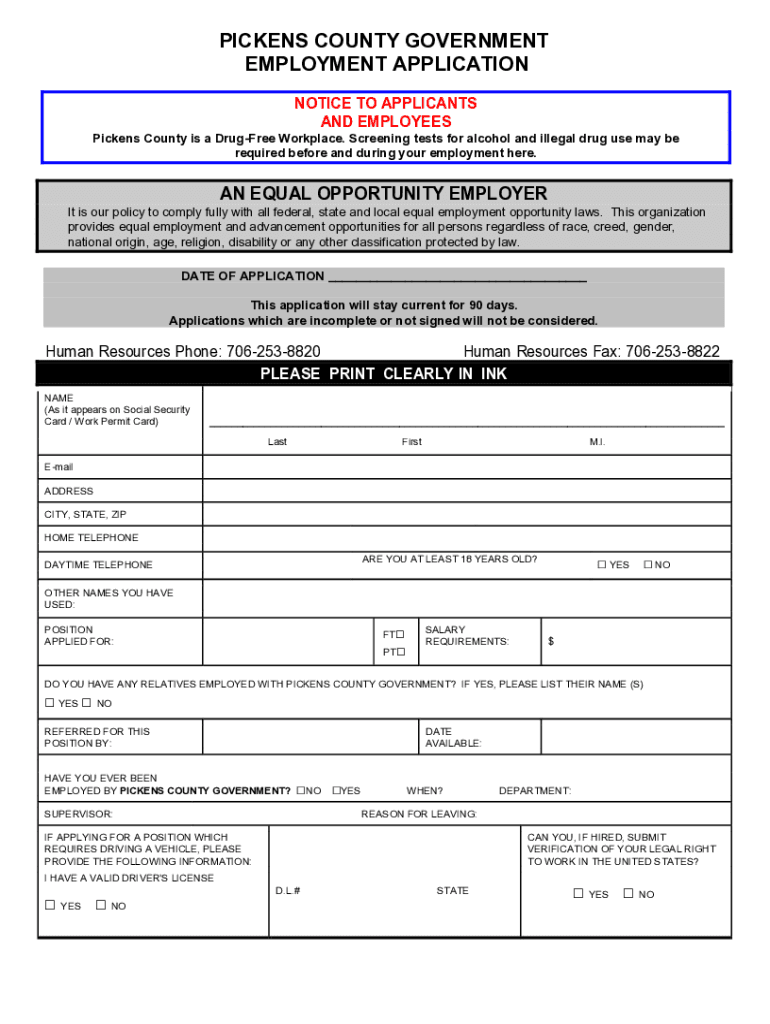 PICKENS COUNTY GOVERNMENT EMPLOYMENT APPLICATION NOTICE TO APPLICANTS AND EMPLOYEES Pickens County is a Degree Workplace. Screening tests for alcohol and illegal drug use may be required before and