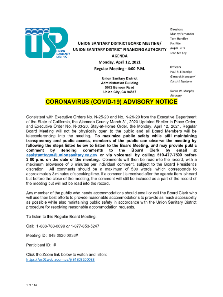 UNIONSANITARYDISTRICTBOARDMEETING/ UNIONSANITARYDISTRICTFINANCINGAUTHORITY AGENDA Monday,April12,2021 RegularMeeting4:00P. M. Union Sanitary District Administration Building 5072 Benson Road Union