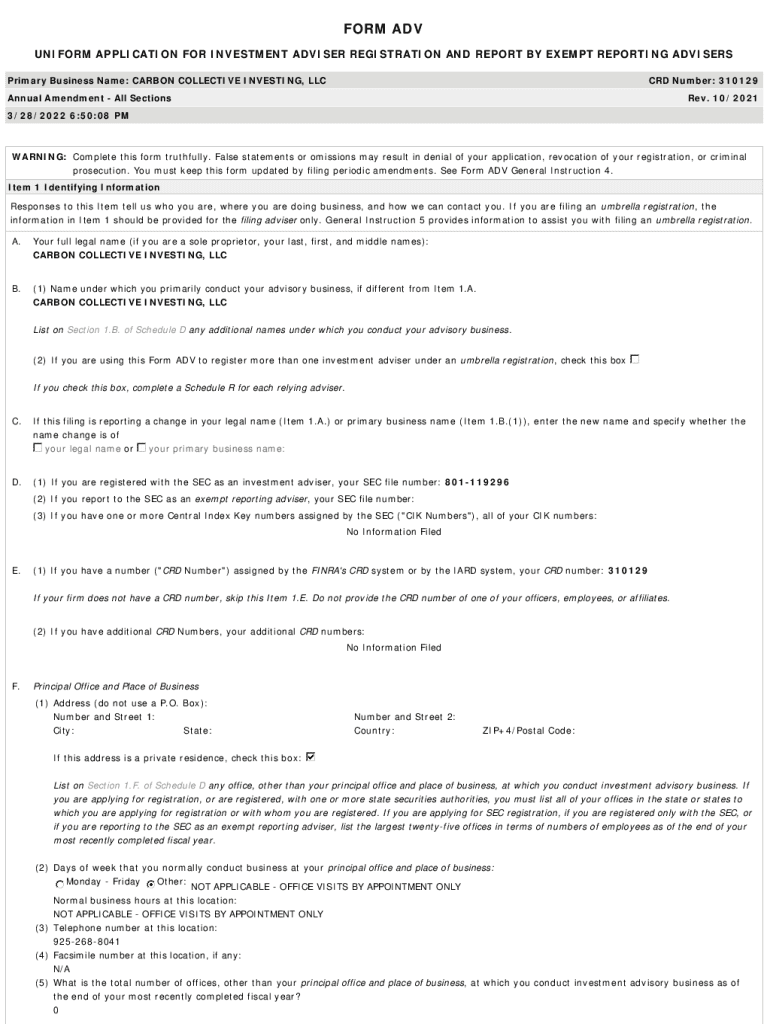 FORM ADV UNIFORM APPLICATION FOR INVESTMENT ADVISER REGISTRATION AND REPORT BY EXEMPT REPORTING ADVISERS Primary Business Name: CARBON COLLECTIVE INVESTING, LLC CRD Number: 310129Annual Amendment