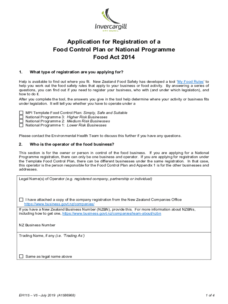 Application for Registration of a Food Control Plan or National Program Food Act 2014 1. What type of registration are you applying for? Help is available to find out where you fit. New Zealand Food
