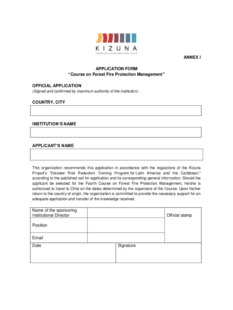 ANNEX I APPLICATION FORM Course on Forest Fire Protection Management OFFICIAL APPLICATION (Signed and confirmed by maximum authority of the institution)COUNTRY, CITYINSTITUTIONS NAMEAPPLICANTS Names