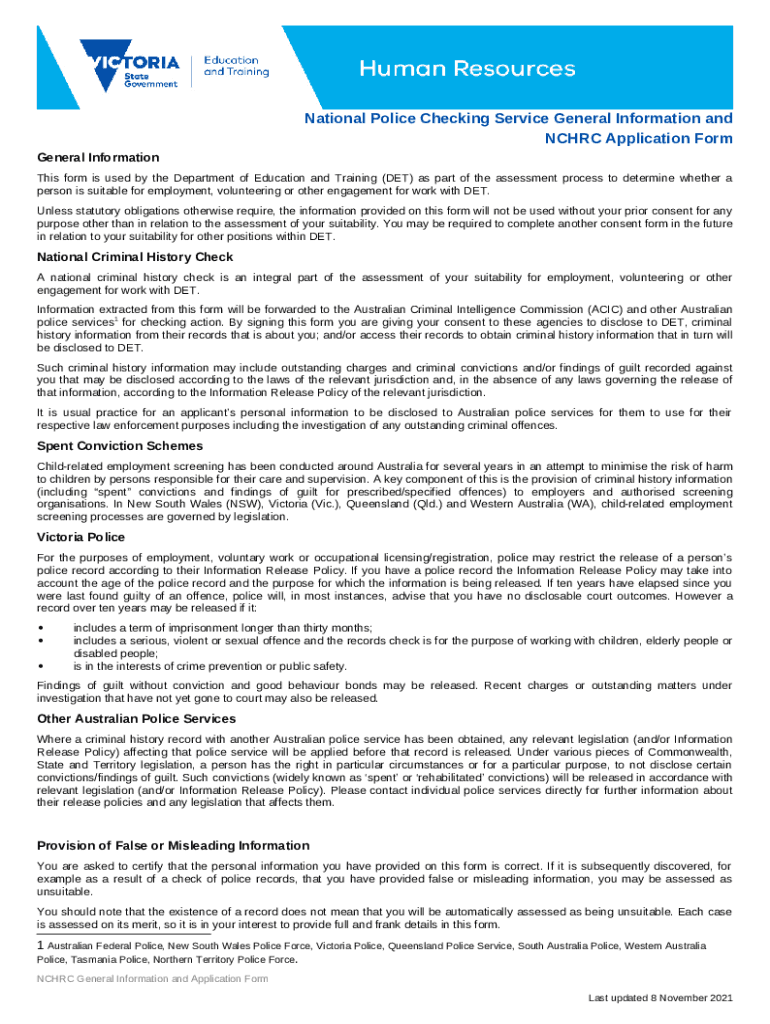 What is www.education.vic.gov.auhrwebDocumentsNational Police Checking Service General Ination and ... Form?