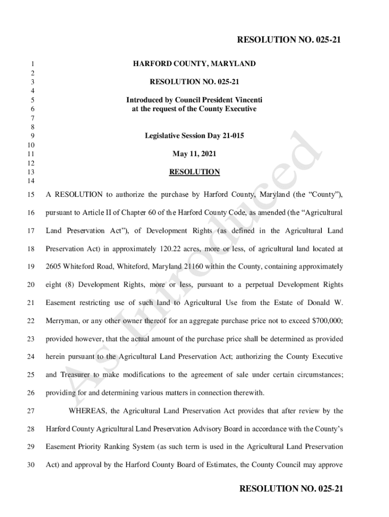 RESOLUTION NO. 02521 1 2 3 4 5 6 7 8 9 10 11 12 13 14HARFORD COUNTY, MARYLAND RESOLUTION NO. 02521 Introduced by Council President Vincent at the request of the County ExecutiveLegislative Session