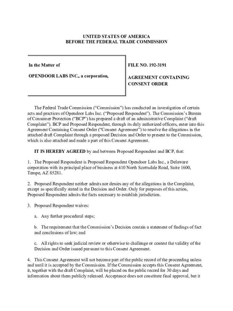 UNITED STATES OF AMERICA BEFORE THE FEDERAL TRADE Commissioning the Matter office NO. 1923191OPENDOOR LABS INC., a corporation, AGREEMENT CONTAINING CONSENT Order Federal Trade Commission (Commission)