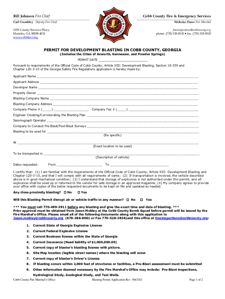 Bill Johnson Fire Chief Cobb County Fire & Emergency Services Carl Crumble Deputy Fire Chief Nicholas Date Fire Marshal1595 County Services Pkwy. Marietta, GA 300084021 www.cobbfmo.orgfmoinspections@cobbcounty.org
