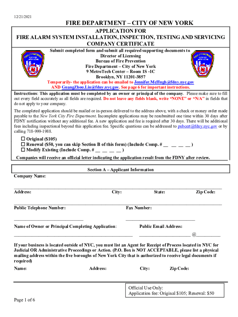 12/21/2021 FIRE DEPARTMENT — CITY OF NEW YORK APPLICATION FOR FIRE ALARM SYSTEM INSTALLATION, INSPECTION, TESTING AND SERVICING COMPANY CERTIFICATE Submit completed form and submit all required