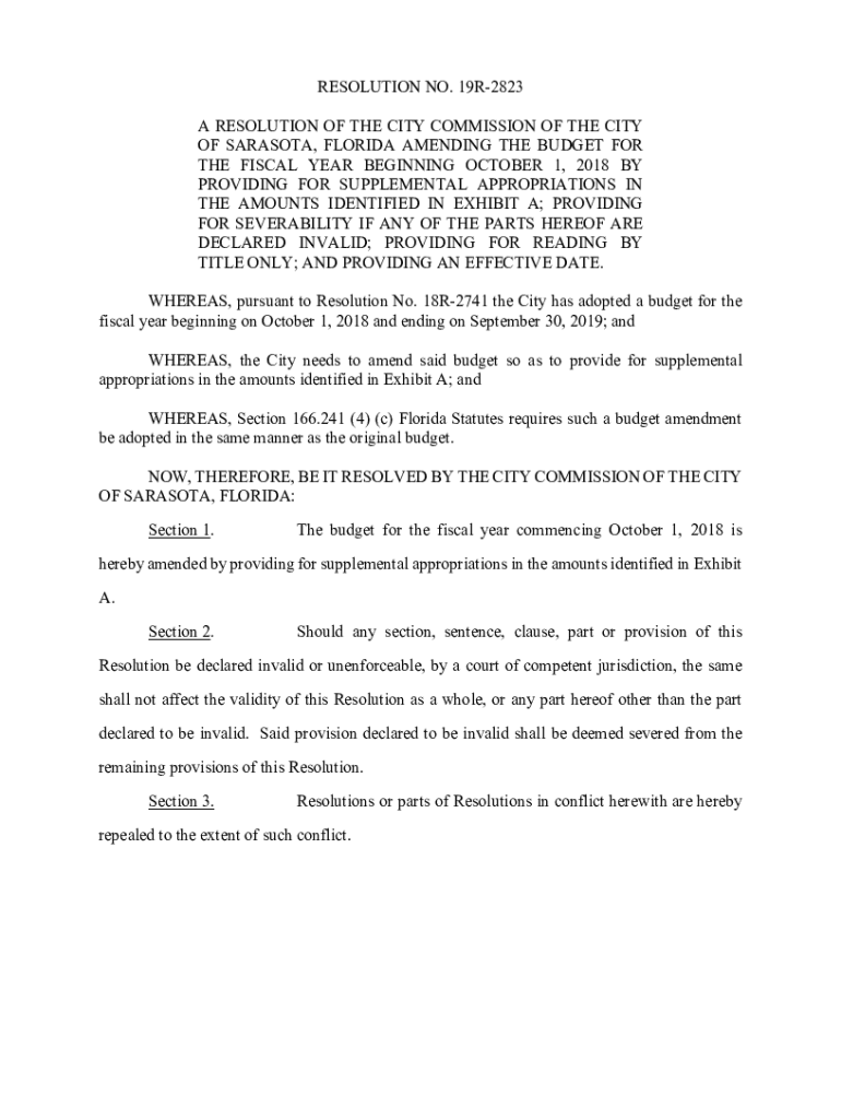 RESOLUTION NO. 19R2823 A RESOLUTION OF THE CITY COMMISSION OF THE CITY OF SARASOTA, FLORIDA AMENDING THE BUDGET FOR THE FISCAL YEAR BEGINNING OCTOBER 1, 2018, BY PROVIDING FOR SUPPLEMENTAL APPROPRIATIONS