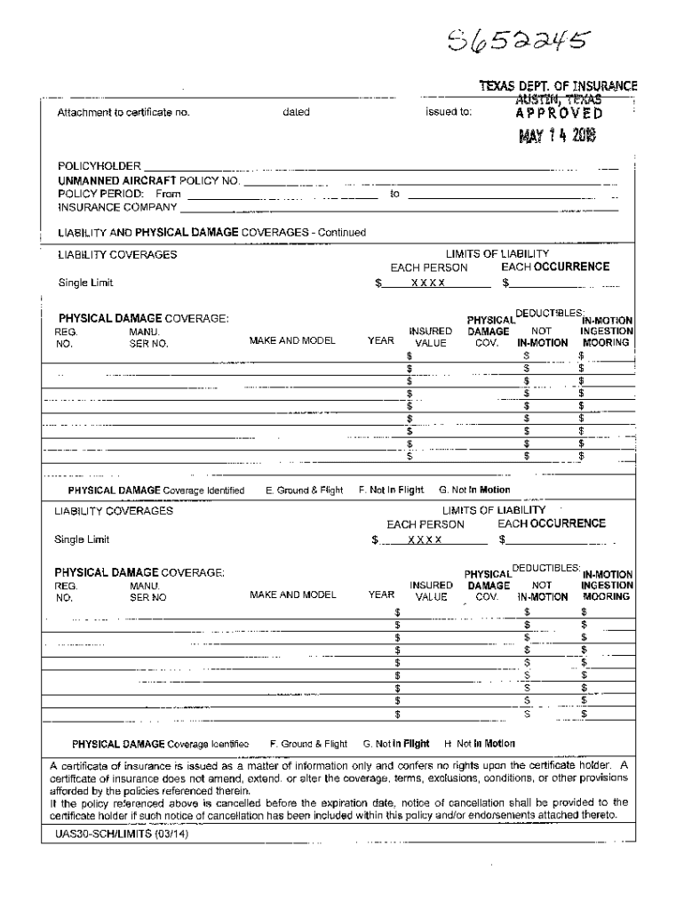 TEXAS Attachment to certificate no. Issued to:datedINSURANCE AUSTIN, TEXAS DEPT.APPOFR0VEDMAY 14 2018 POLICYHOLDER UNMANNED AIRCRAFT POLICY NO. POLICY PERIOD: From INSURANCE COMPANYtoLIABILITY AND