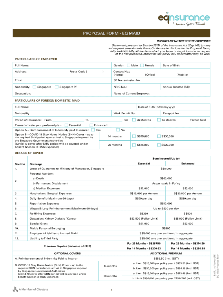 PROPOSAL FORM EQ MAID IMPORTANT NOTICE TO THE PROPOSER Statement pursuant to Section 25(5) of the Insurance Act (Cap.142) (or any subsequent amendments thereof) You are to disclose in this Proposal