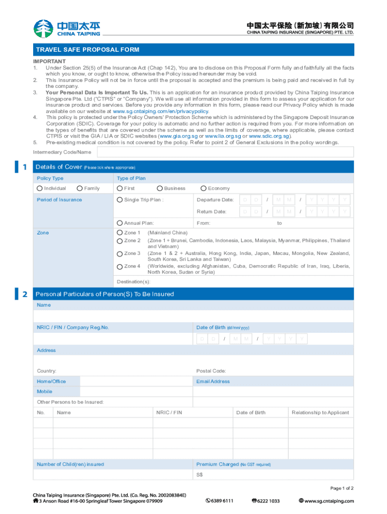 Anyone who is planning to travel and wants to obtain travel insurance coverage needs the wwwsgcntaipingcomimagesdocumenttravel safe proposal form.
