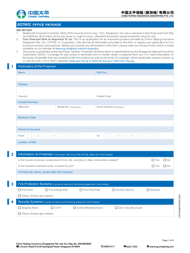 OFFICE PACKAGE IMPORTANT 1. Statement Pursuant to Section 25(5) of the Insurance Act (Cap. 142), Singapore: You are to disclose in this Proposal Form fully and faithfully all the facts which you know