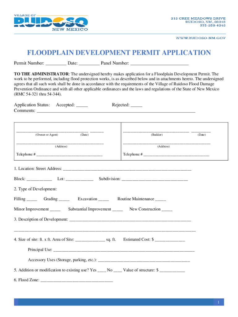 FLOODPLAIN DEVELOPMENT PERMIT APPLICATION Permit Number: ___ Date: ___ Panel Number: ___ TO THE ADMINISTRATOR: The undersigned hereby makes application for a Floodplain Development Permit. The work