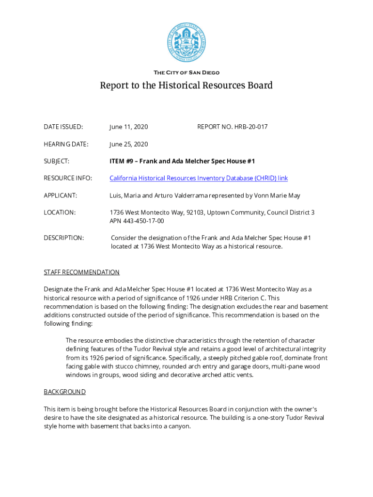 The City of San DiegoReport to the Historical Resources Boardwalk ISSUED:June 11, 2020REPORT NO. HRB20017HEARING DATE:June 25, 2020SUBJECT:ITEM #9 Frank and Ada Belcher Spec House #1RESOURCE INFO:California