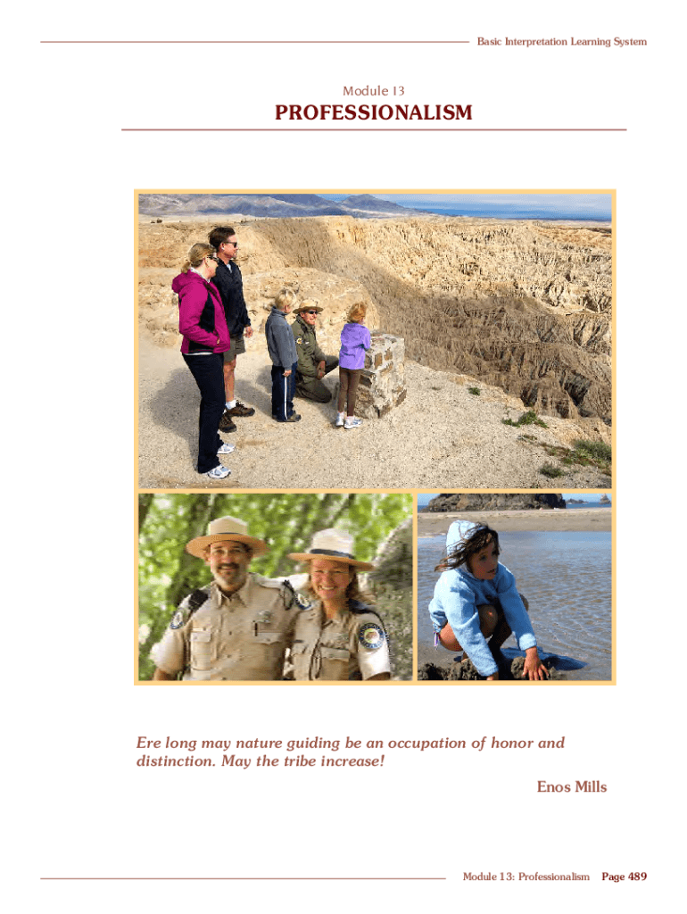 Basic Interpretation Learning SystemModule 13PROFESSIONALISMEre long may nature guiding be an occupation of honor and distinction. May the tribe increase! Enos Millijoule 13: Professionalism Page