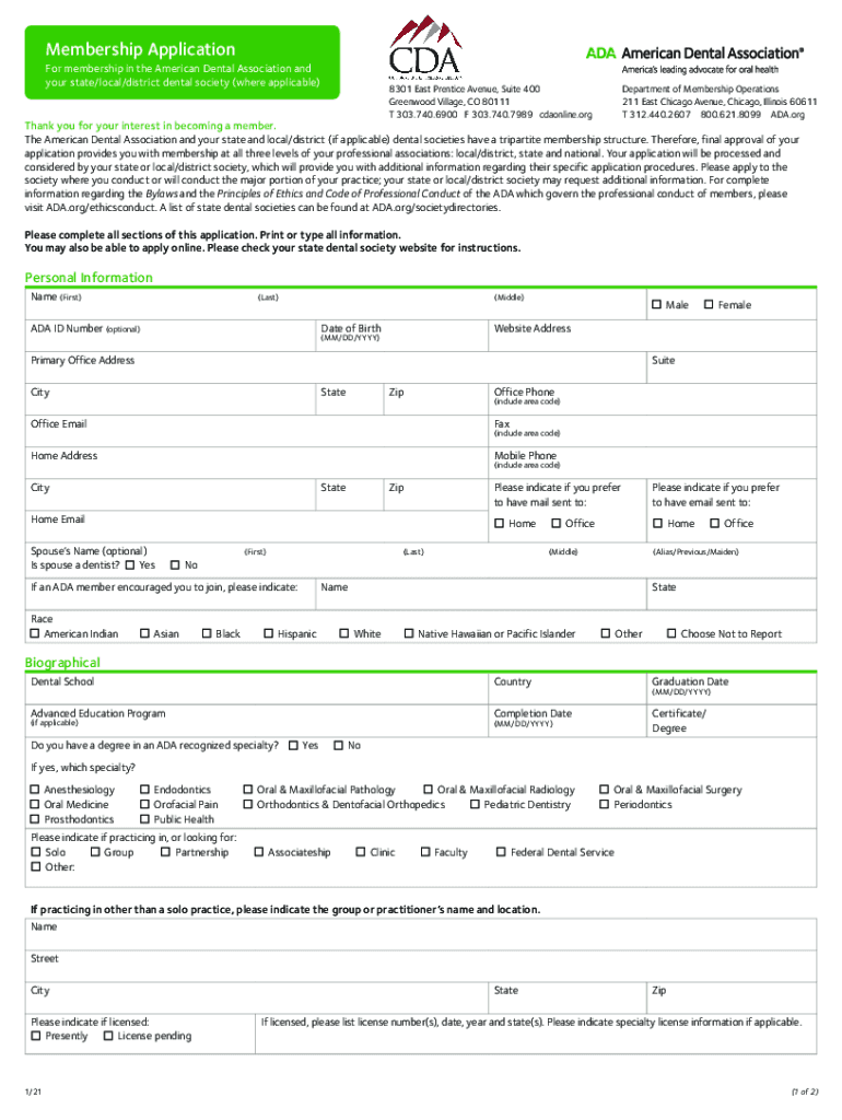Membership Application membership in the American Dental Association and your state/local/district dental society (where applicable)3690 East S. Yosemite, 100Suite 400 8301 PrenticeSuite Avenue, Denver,