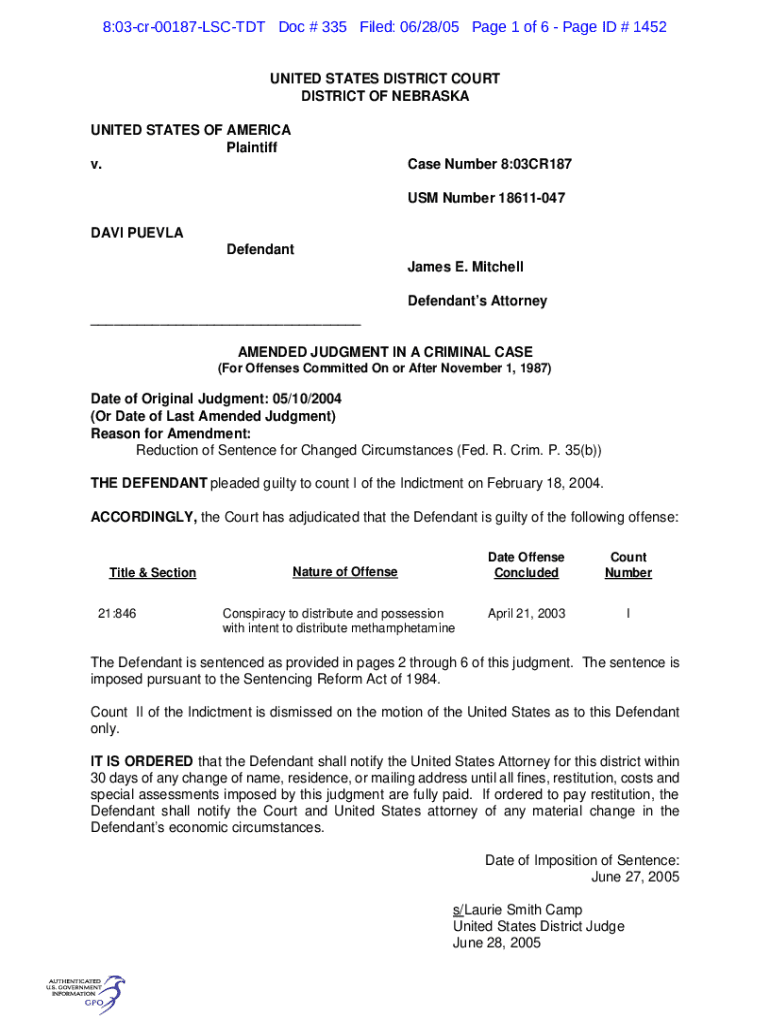 8:03cr00187LSCTDT Doc # 335 Filed: 06/28/05-Page 1 of 6-Page ID # 1452 UNITED STATES DISTRICT COURT DISTRICT OF NEBRASKA UNITED STATES OF AMERICA Plaintiff v. Case Number 8:03CR187 US Number 18611047DAVI
