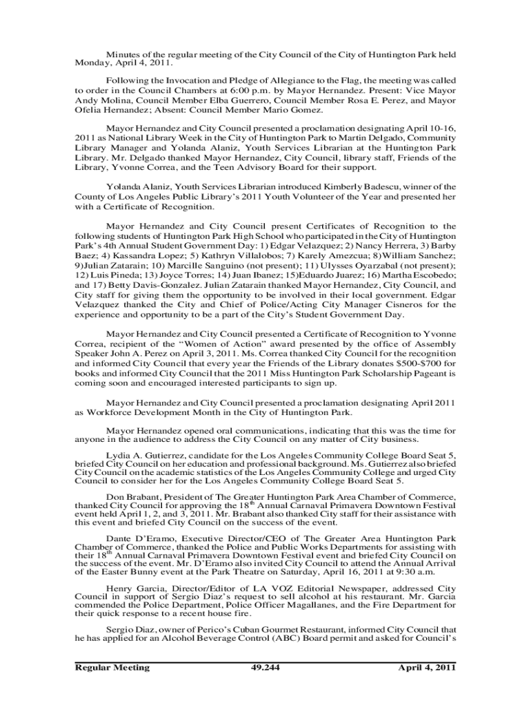 Minutes of the regular meeting of the City Council of the City of Huntington Park held Monday, April 4, 2011. Following the Invocation and Pledge of Allegiance to the Flag, the meeting was called