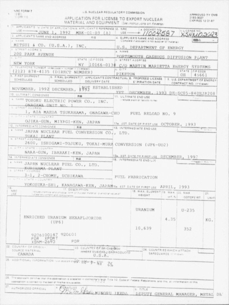 ||NEC FORM 7×J.S. NUCLEAR AEGULATO3Y COMMitslONi2 816\'o cF9110ApMOVED SY OM8 3154 0027APPLICATION FOR LICENSE TO EXPORT NUCLEAR MATERIAL AND Equipment tSeeinstrucuans on newsesExpires 12 s147t[1.