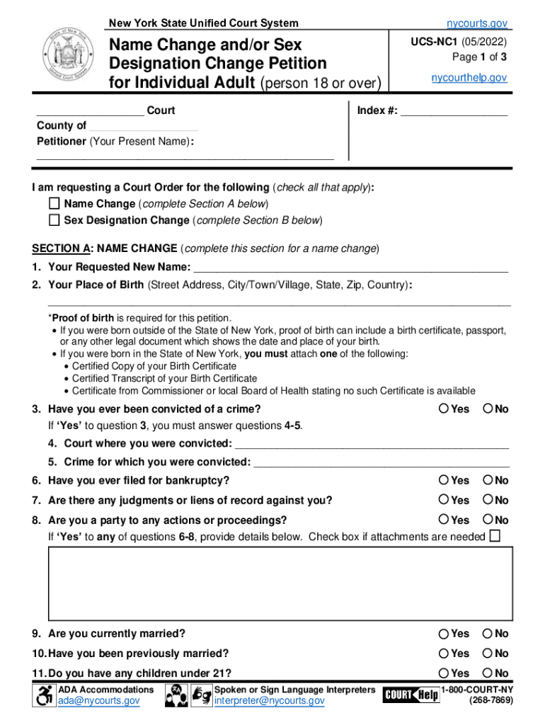 Reset Former York State United Court Systemnycourts. Game Change and/or Sex Designation Change Petition for Individual Adult (person 18 or over) ___ Court County of ___ Petitioner (Your Present Name):