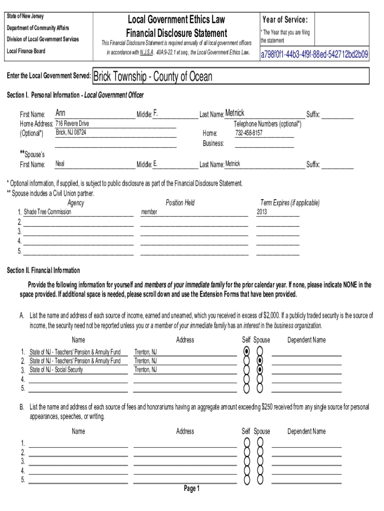 Local Government Ethics Law Financial Disclosure StatementState of New Jersey Department of Community Affairs Division of Local Government Services Local Finance Carpenter the Local Government Served:Year